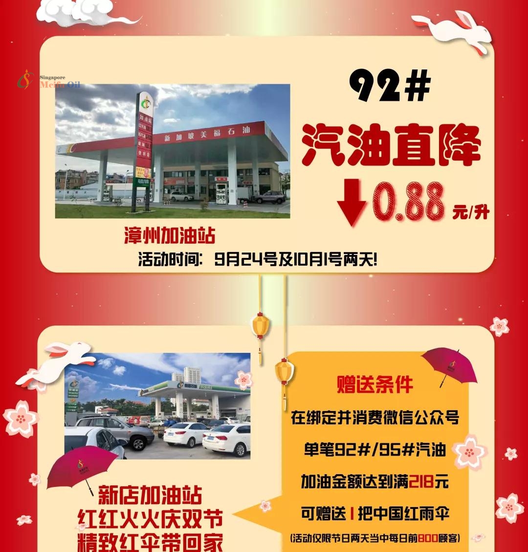 09月 中秋國(guó)慶禮物已備好,雙節(jié)當(dāng)天活動(dòng)強(qiáng)勢(shì)登陸! 美福石油活動(dòng)預(yù)告! 中秋國(guó)慶,雙節(jié)同慶! 9月24號(hào),10月1號(hào) 節(jié)日當(dāng)天,美福石油各大加油站 活動(dòng)齊放,廣大顧客朋友們千萬(wàn)不要錯(cuò)過(guò)! 美福石油 / 2018-09-19 09:25:00 萬(wàn)水千山,粽是情晉江人民有福了!這家加油站即將盛大開(kāi)業(yè)!重磅直降!