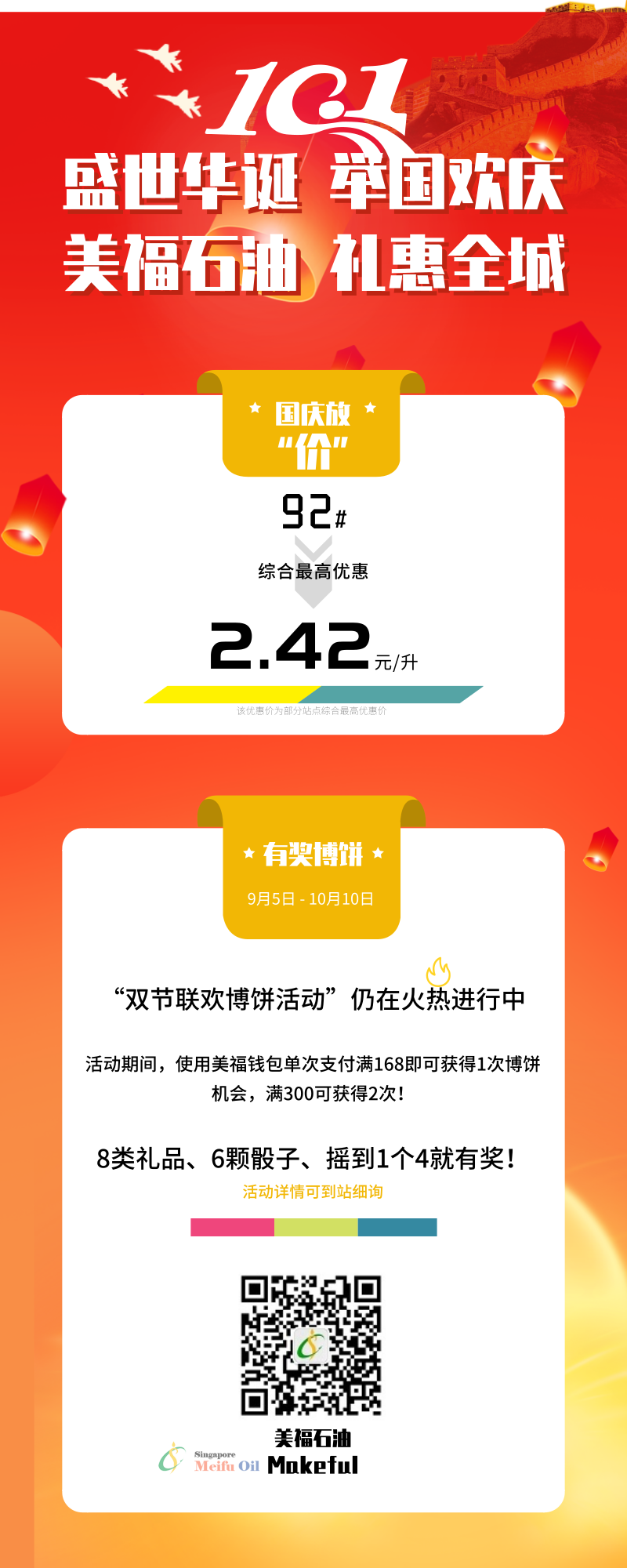 09月 美福石油國慶放“價”通知:汽油最高優惠2.42元/升,博餅活動仍在繼續! 美福石油 / 2019-09-29 15:02:51 金花涌現、狀元連連,美福雙節聯歡活動火熱進行中!金秋十月 美福品惠