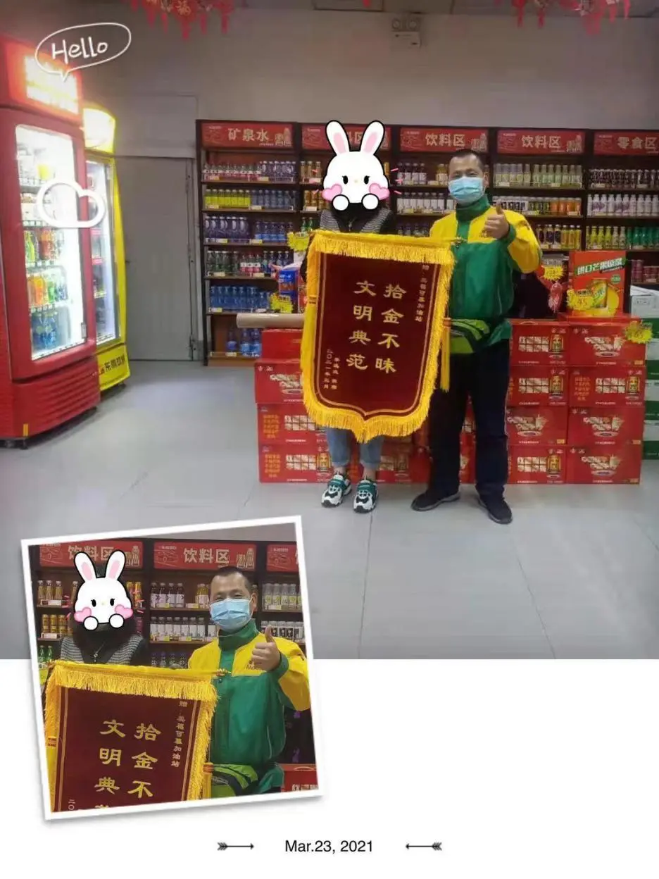 3月17日晚上,可慕加油站站長阮帥在便利店收銀臺處撿到了客戶遺落在便利店的一把蘋果手機,在與客戶聯系后歸還給客戶,并婉言謝絕客戶的酬謝。3月21日客戶特意帶來了一面“拾金不昧、文明典范”的錦旗,表達了對加油站人員的感謝。